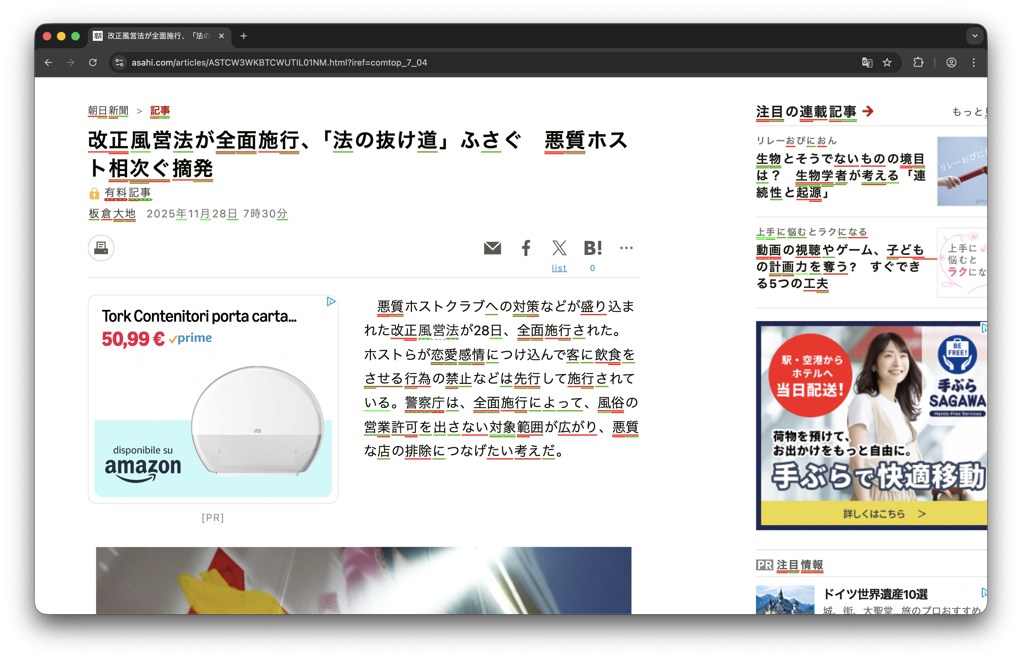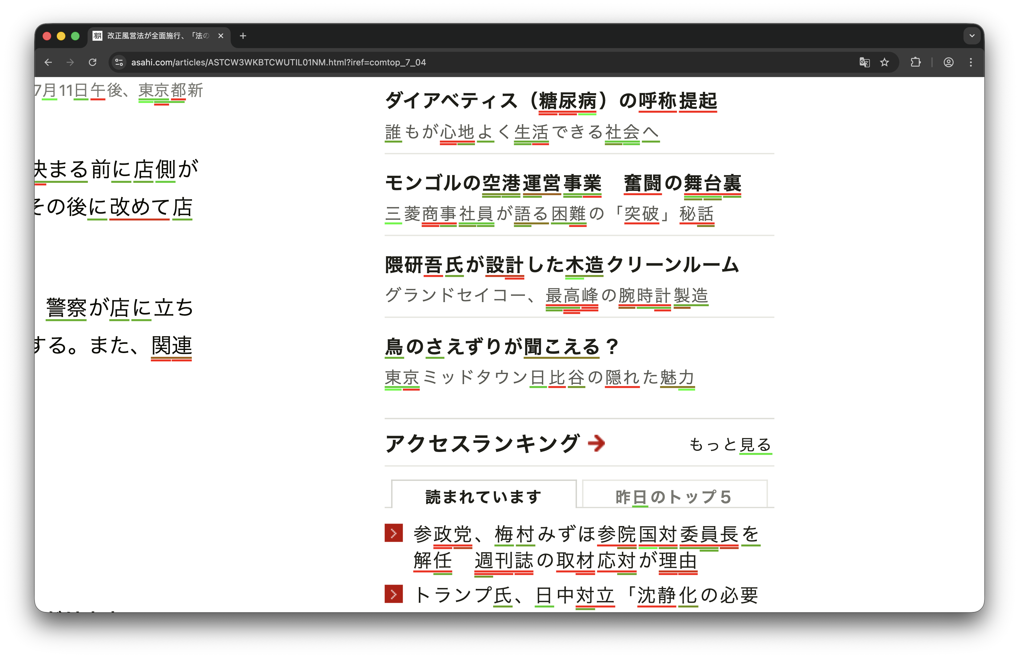 Over the past year I have been intermittently memorizing over a thousand kanji and a few thousands of Japanese vocabulary words. Although I often struggled to gauge my reading comprehension, some words I knew well, others I had never seen, out of frustration I spent an evening coding a Chrome extension that loads your Anki deck and immediately lets you visualize your progress in reading comprehension. In simple terms, words you know well are underlined in green, while those you know less well in red. Available now on my GitHub at this link. Free for anyone to use as they please under any permissive license that may apply.